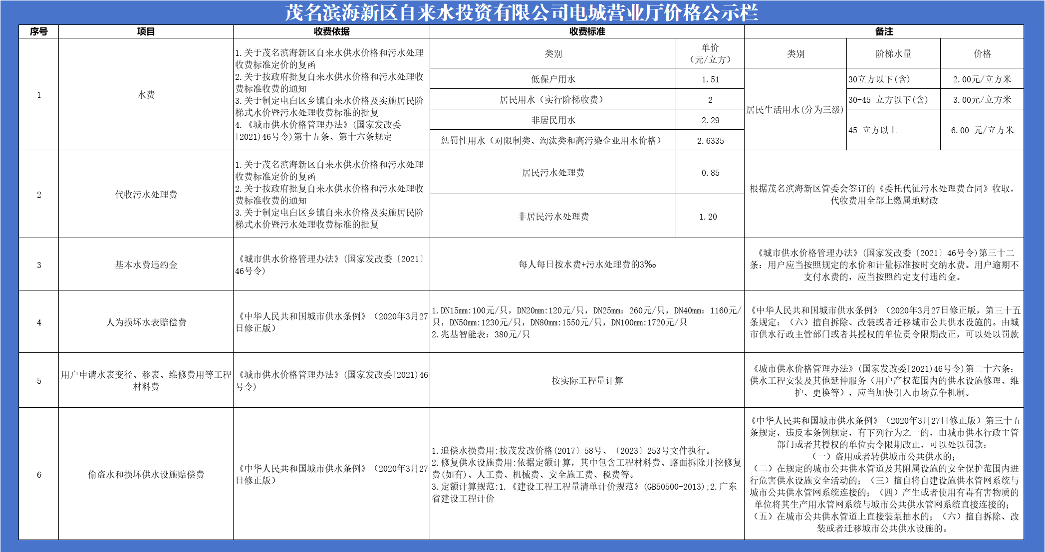 茂名濱海新區自來水投資有限公司自來水收費標準公示
